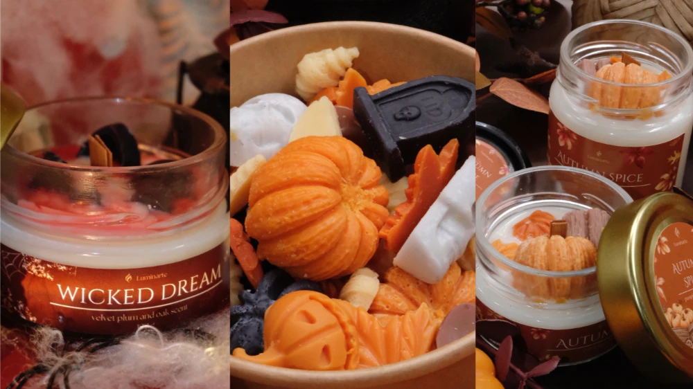 Lumânări, wax melts și odorizante cu arome de dovleac, scorțișoară și frunze ruginii – gata să-ți parfumeze zilele de toamnă.