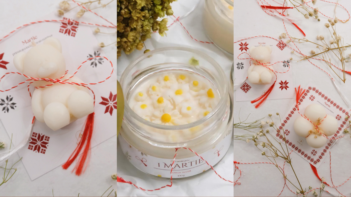 Lumânări din ceară naturală de soia și mini mărțișoare, create pentru a celebra femeile speciale din viața ta